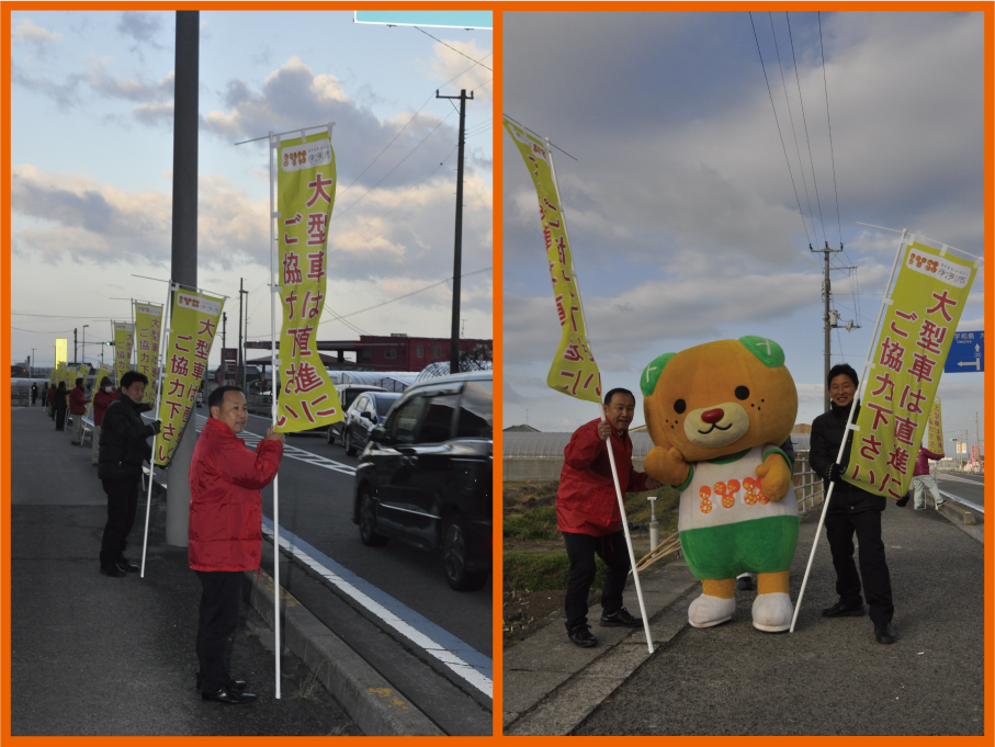 そこで令和元年12月27日のAM7:00~5時間、大型車のドライバーに出来るだけ県道を直進して頂く啓発活動を行いました。 当日は冬でもあり非常に寒く、7時前は真っ暗な早朝から準備し、地元の方々と力を合わせて啓発を行いました。 |